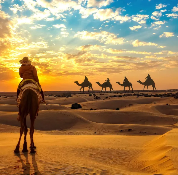 Camel Ride at Sam Sand Dunes : Experience a golden sunset over the Thar Desert. A camel ride at Sam Sand Dunes offers a classic desert experience, with options ranging from short sunset rides to full-day or overnight packages that include traditional activities and meals. A short sunset camel ride and treditional folk dance programme . [ optional ] back to Hotel in Jaisalmer.